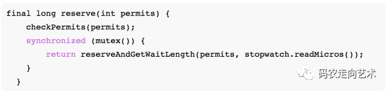 reserve需要获取锁才可以操作,这也是令牌桶线程安全的原因,以下操作都在同步代码块中。