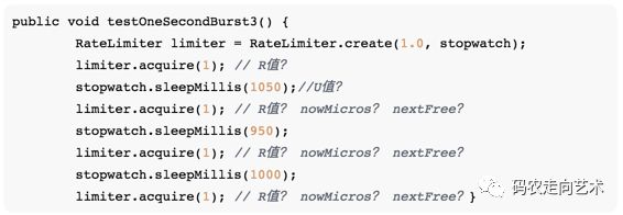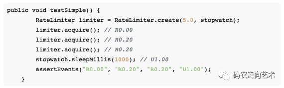 经过上面的代码梳理,详细大家对RateLimiter的代码有个比较清晰的认识,但要加深理解,还需要多做debug和test。Guava包里面包括了很多test case。我们可以把test类单拿出来,根据自己的情况添加相应的case即可。该类是com.google.common.util.concurrent. RateLimiterTest。由于很多类都使用了默认访问权限,我们需要定义一个 com.google.common.util.concurrent包,导入RateLimiterTest类。该类中,guava提供了一个FakeStopwatch的nested class。它能够让时钟按照我们的要求暂停,休眠随意的时长,并记录休眠和请求对应的事件,并已特定的格式输出。例如:R1.00代表请求给定的令牌延迟了1秒;U1.05表示stopwatch休眠1.05秒,即模拟时钟过了1.05秒。例如一个测试通过的case: