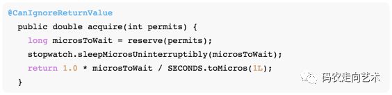 reserve方法返回获取令牌所需要等待的时间,stopwatch阻塞当前线程,最后返回线程休眠的秒数。如果microsToWait为0,表示立即返回。
