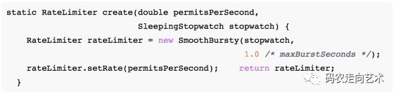 RateLimiter类提供了令牌桶的接口,它是一个抽象类,其子类有SmoothRateLimiter(也是个抽象类)以及孙子类SmoothBursty,SmoothWarmingUp。SmoothRateLimiter类实现了算法的核心部分,因次我们暂且只讨论SmoothRateLimiter和其实现类SmoothBursty。RateLimiter都是通过静态的create函数实例化。以create(double permitsPerSecond)为例。参数permitsPerSecond为配置的QPS。该方法简洁明了,屏蔽了很多用户无需关心的细节。