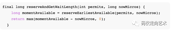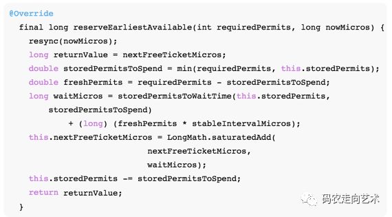 首先调用reserveEarliestAvailable,方法名说明了返回值的意义:即返回满足当前请求的最早的时钟,该值大于等于nowMicros。如何保证这一点的呢?我们看该方法: