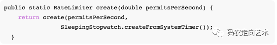 接着该方法调用了create(permitsPerSecond, SleepingStopwatch.createFromSystemTimer())方法(该方法由于是包的访问权限,在实际的项目中,基本不会直接调用),同时创建了一个StopWatch,自动启动。
