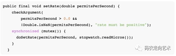 该方法创建了SmoothBursty实例,up-casting为RateLimiter。maxBurstSeconds固定为1,说明令牌桶中所能存储的的最大令牌数是1*QPS。接着调用setRate方法,该方法初始化一些重要的参数: