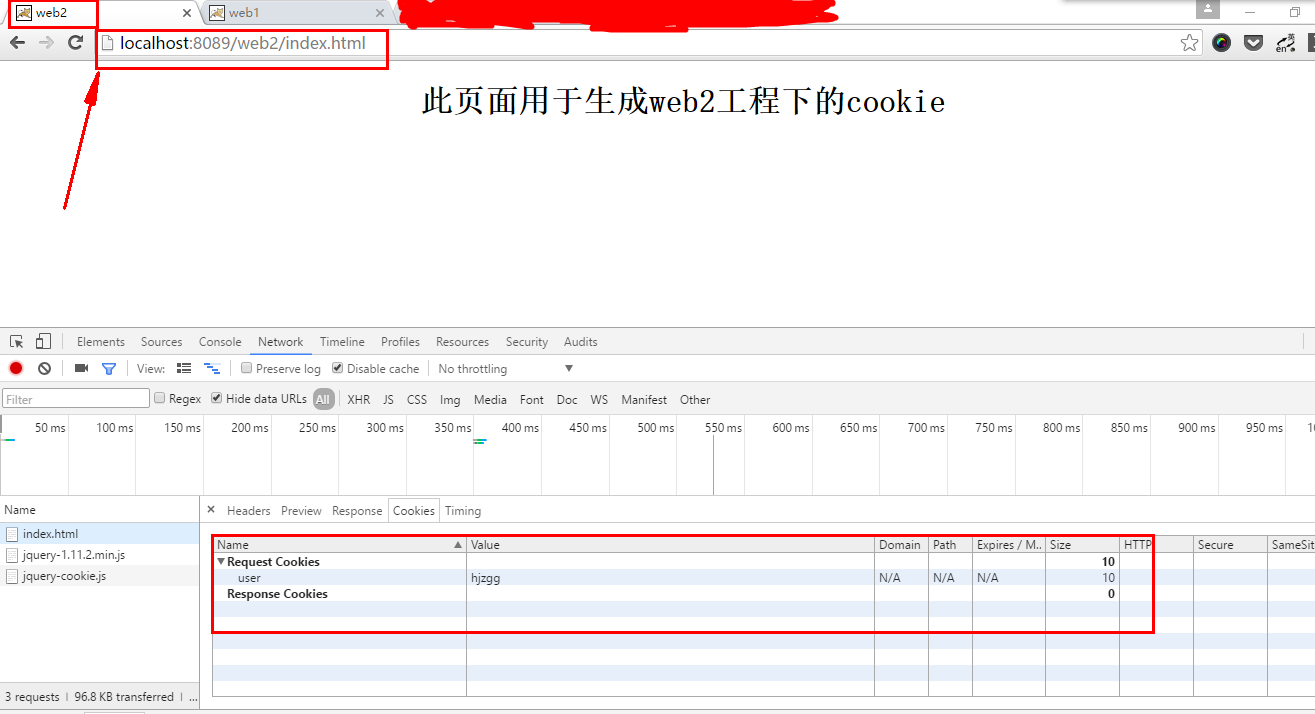 两个工程web1, web2, 部署在同一台机器上的不同tomcat上,请求web1工程的index.html,如下: