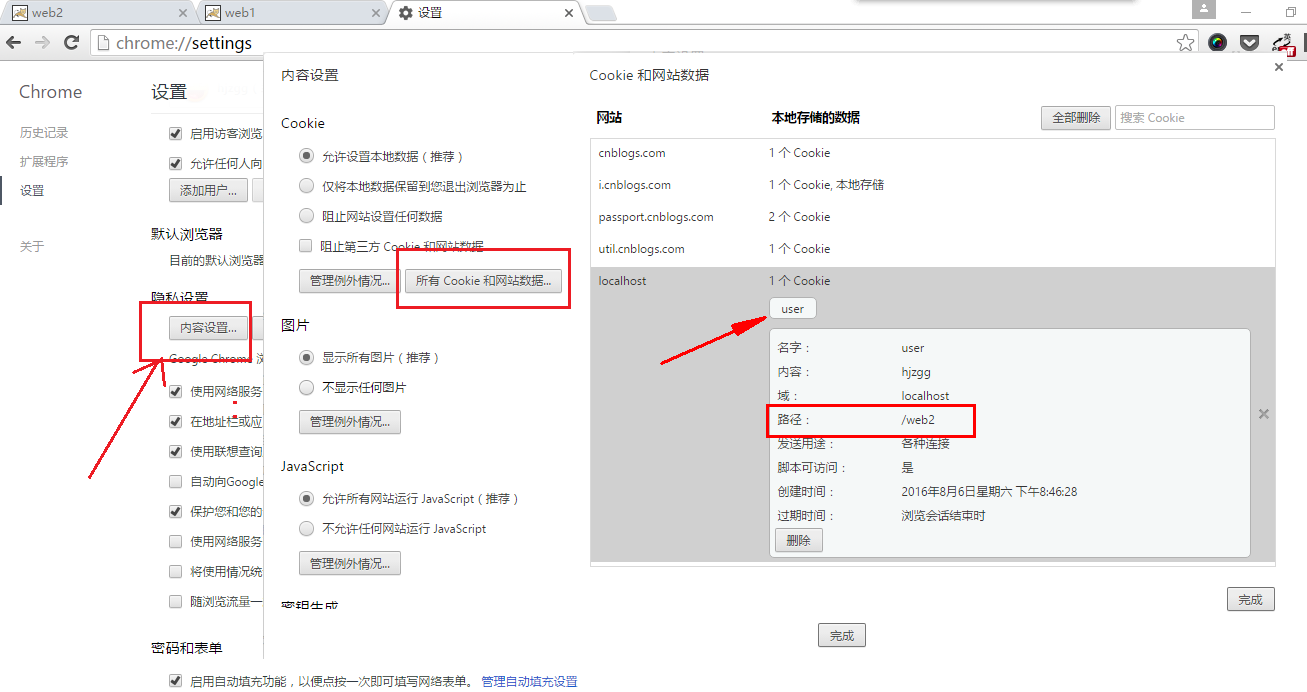 或者通过浏览器设置->显示高级设置->隐私设置来查看写入的cookie,过程如下。
