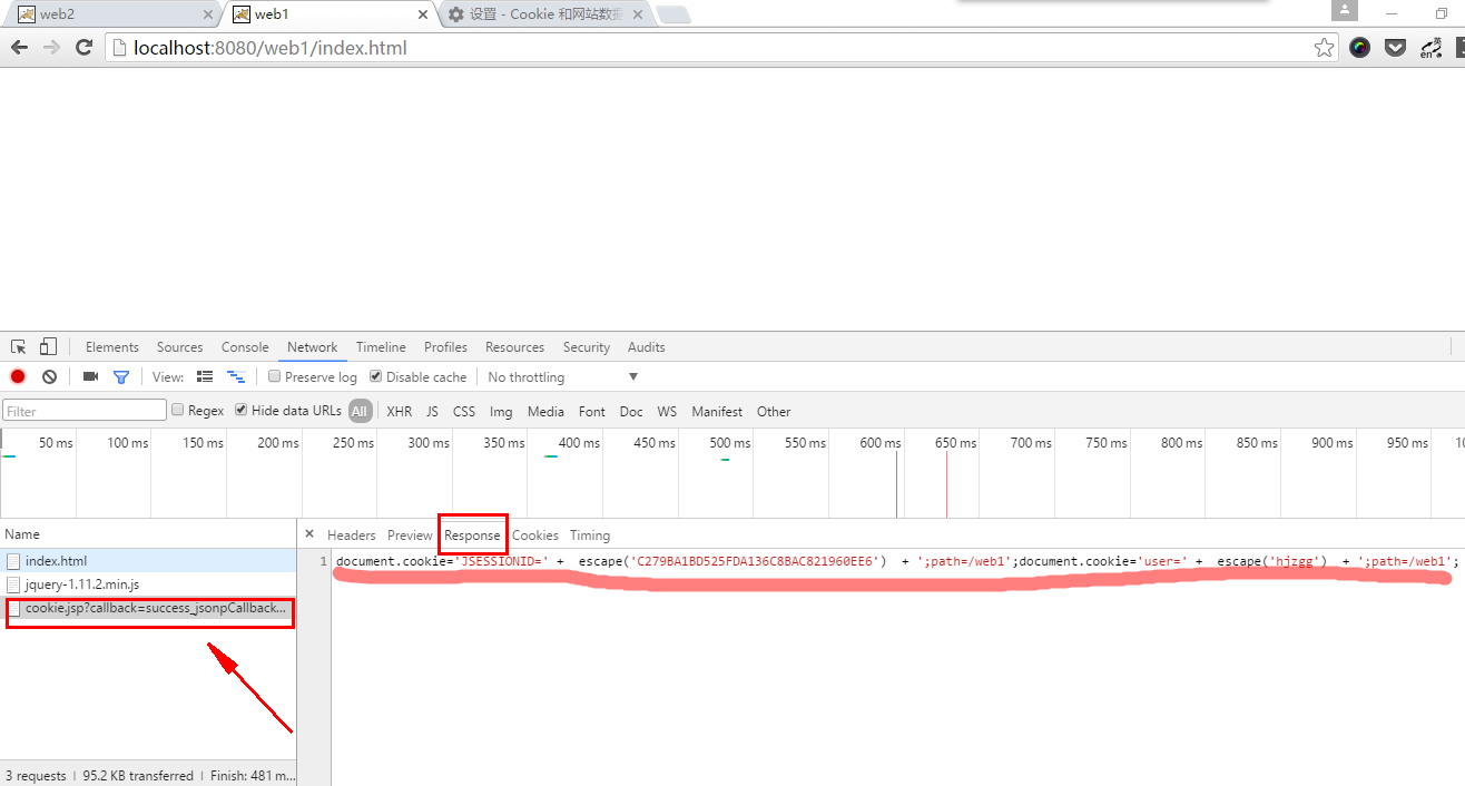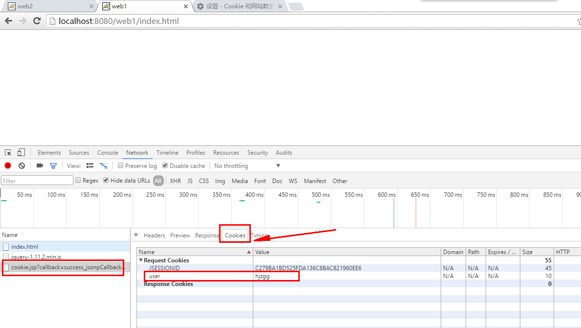 接着,打开另一个窗口,访问http://localhost:8080/web1/index.html,这个页面是请求web2工程写入的cookie(注意,如果我们不是通过jsonp方式去访问,那么浏览器就会出现 不允许跨域访问 的提示)。同样 F12, Network视图,查看返回的数据如下。