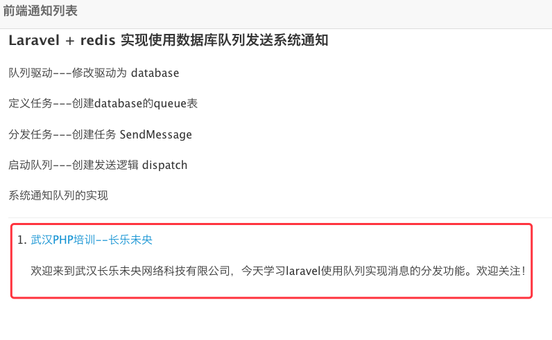 6、测试:浏览器访问前端地址:http://queue.test/notice,你会看到如下页面,即为消息分发成功: