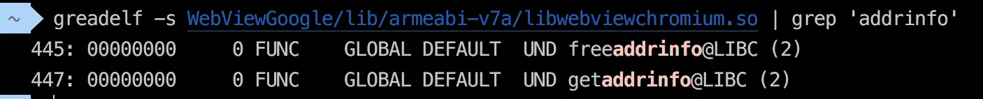 在关于webview的这几个so里面,都没有找到android_getinfofornet。没得办法,我们只能去看下libwebviewchromium。