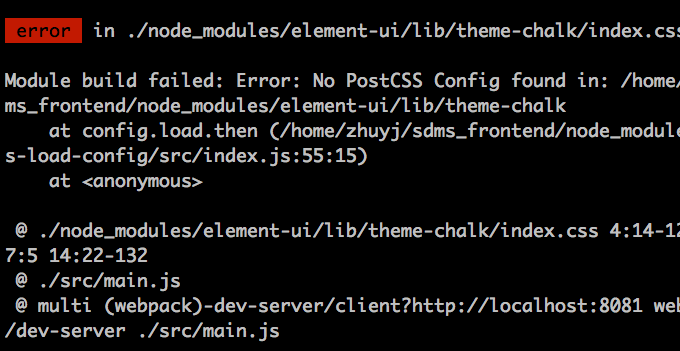 vue-cli 引入 element-ui npm run dev 报错 No Postcss 猪猪是天才 2018-09-01 375 阅读1分钟 背景:vue-cli 引入 element-ui 运行 npm run dev 时 报错:解决办法:在项目根目录添加 postcss.config.js 文件,内容如下:module.exports = { plugins: { 'autoprefixer': {browsers: 'last 5 version'} } }完美解决!~