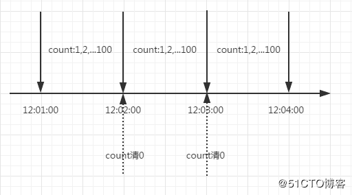 这里需要注意的是,存在一个时间临界点的问题。举个栗子,在12:01:00到12:01:58这段时间内没有用户请求,然后在12:01:59这一瞬时发出100个请求,OK,然后在12:02:00这一瞬时又发出了100个请求。这里你应该能感受到,在这个临界点可能会承受恶意用户的大量请求,甚至超出系统预期的承受。