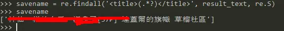 然后我们需要在源码中找到标题,一会用作保存文件的文件名,标题的寻找的实现代码是,这样返回的是一个list,我们用的时候直接取第0个就好(程序猿数数都是从零开始的)。