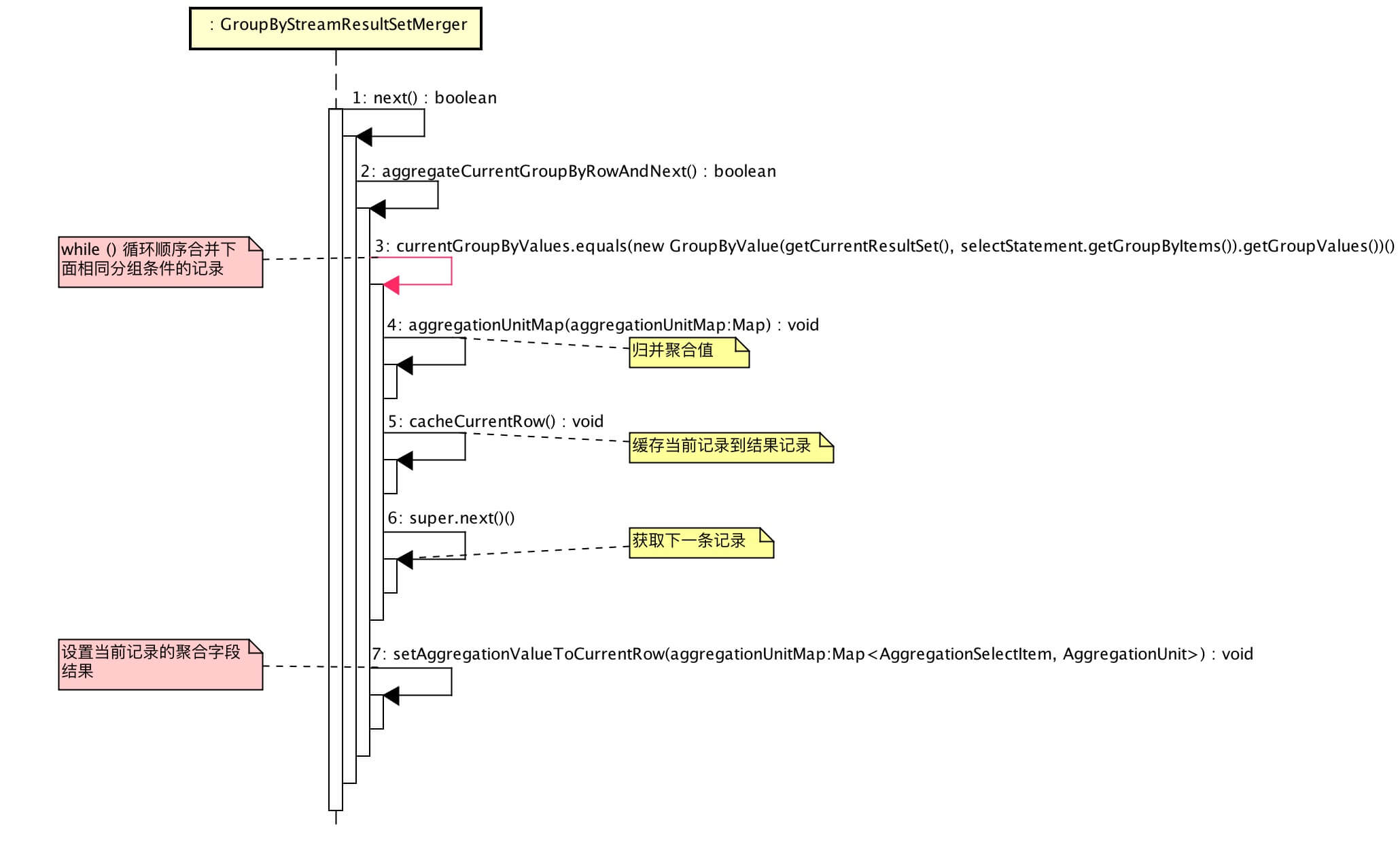 #initForFirstGroupByValue()初始化分组条件到dataMap,aggregationMap映射中,这样可以调用#aggregate()将聚合值归并到aggregationMap里的该分组条件。private void initForFirstGroupByValue(final ResultSet resultSet, final GroupByValue groupByValue, final Map<GroupByValue, MemoryResultSetRow> dataMap, final Map<GroupByValue, Map<AggregationSelectItem, AggregationUnit>> aggregationMap) throws SQLException { // 初始化分组条件到 dataMap if (!dataMap.containsKey(groupByValue)) { dataMap.put(groupByValue, new MemoryResultSetRow(resultSet)); } // 初始化分组条件到 aggregationMap if (!aggregationMap.containsKey(groupByValue)) { Map<AggregationSelectItem, AggregationUnit> map = Maps.toMap(selectStatement.getAggregationSelectItems(), new Function<AggregationSelectItem, AggregationUnit>() { @Override public AggregationUnit apply(final AggregationSelectItem input) { return AggregationUnitFactory.create(input.getType()); } }); aggregationMap.put(groupByValue, map); } } ``` * 聚合完每个分组条件后,将聚合列结果 `aggregationMap` 合并到 `dataMap`。 ```Java private void setAggregationValueToMemoryRow(final Map<GroupByValue, MemoryResultSetRow> dataMap, final Map<GroupByValue, Map<AggregationSelectItem, AggregationUnit>> aggregationMap) { for (Entry<GroupByValue, MemoryResultSetRow> entry : dataMap.entrySet()) { // 遍 历内存记录 for (AggregationSelectItem each : selectStatement.getAggregationSelectItems()) { // 遍历 每个聚合列 entry.getValue().setCell(each.getIndex(), aggregationMap.get(entry.getKey()).get(each).getResult()); } } } -