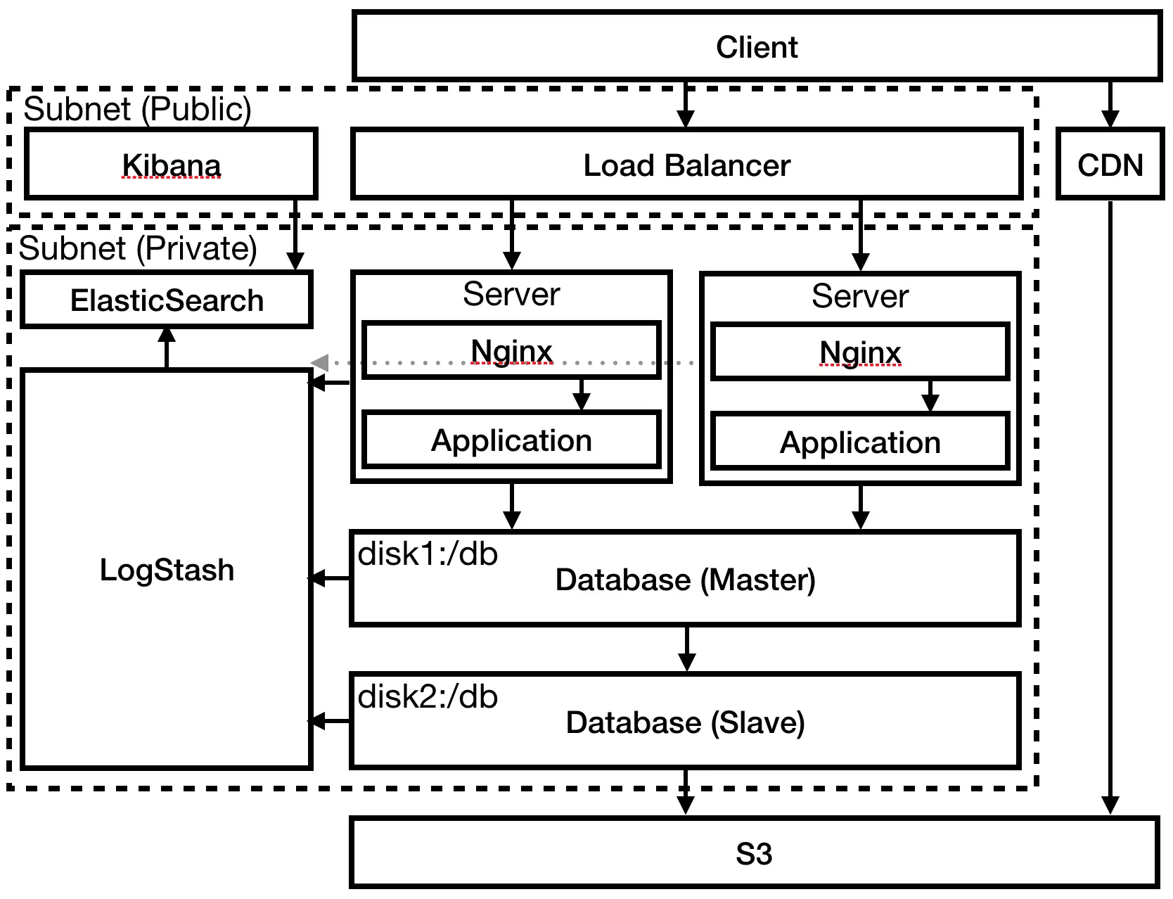 一切看起来都那么好,直到你需要去检查日志。这花费了你一个小时,因为要检查 12 台服务器(每个环境有 4 台服务器)。那是一件麻烦事,幸运的是,你现在已经赚了足够的钱可以实现 ELK 堆栈(ElasticSearch,LogStash,Kibana)。新的架构图: