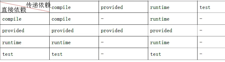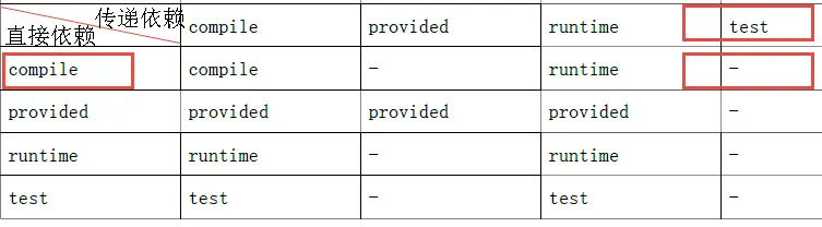 举例:比如 A 对 B 有 compile 依赖,B 对 C 有 runtime 依赖,那么根据表格所示 A 对 C 有 runtime 依赖。