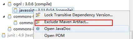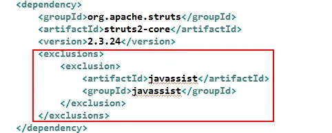 上边的问题也可以通过排除依赖方法辅助依赖调解,如下:比如在依赖 struts2-spring-plugin 的设置中添加排除依赖,排除 spring-beans,下边的配置表示:依赖 struts2-spring-plugin,但排除 struts2-spring-plugin 所依赖的 spring-beans。