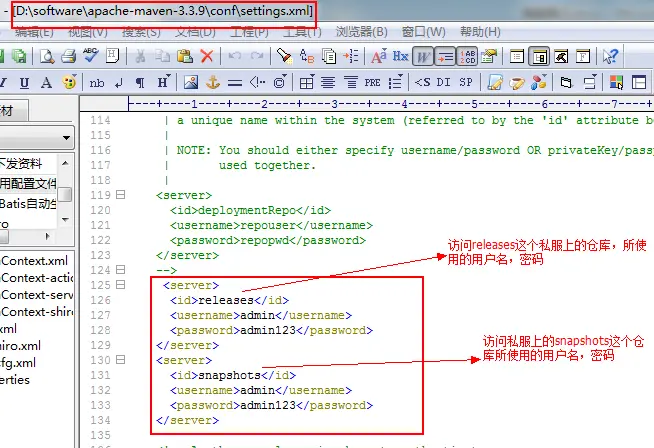 1)第一步: 需要在客户端即部署 dao 工程的电脑上配置 maven 环境,并修改 settings.xml 文件,配置连接私服的用户和密码 。