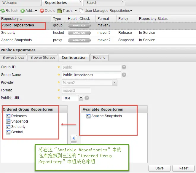 3)group,仓库组,用来合并多个 hosted/proxy 仓库,通常我们配置自己的 maven 连接仓库组。