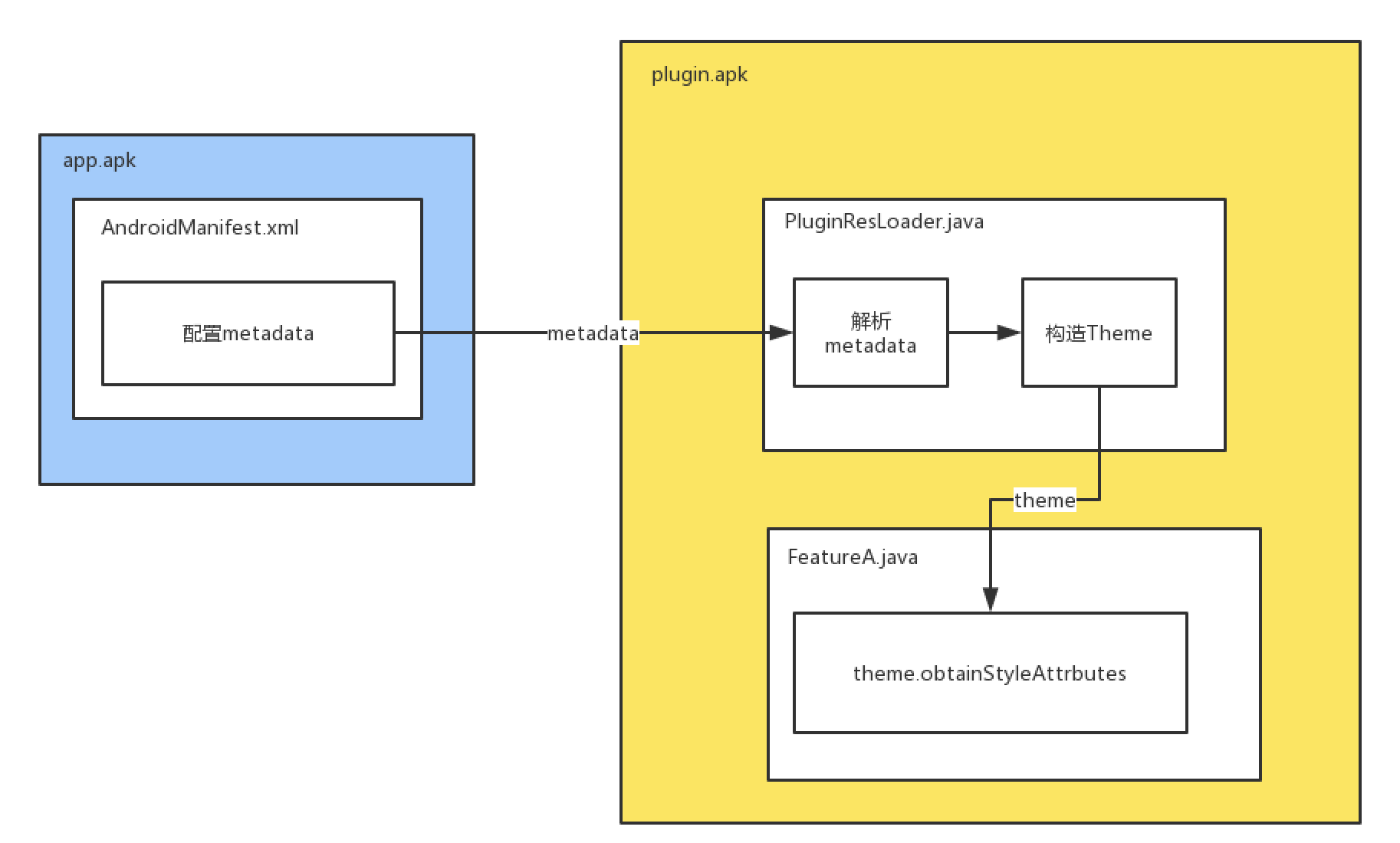 我们知道framework是通过读取Activity或Application设置的theme白噢钱来设置theme对象的,那我们的plugin是否也可以在AndroidManifest.xml文件里读取这样类似的标签呢?答案是肯定的。