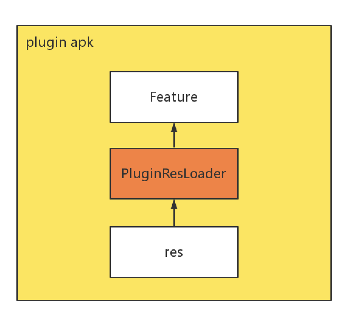 plugin里的代码是不能按照普通的方式直接加载资源的,因为plugin里拿到的context都是从app传过来的,如果按照普通的方式加载资源,加载的都是app的资源,无法加载到plugin apk里的资源。所以我们需要在plugin的feature和res中间加入一个中间层:PluginResLoader,来专门负责加载资源,结构如下: