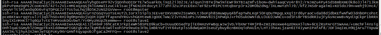 将其它节点机器的ssh的id_rsa.pub公钥文件中的加密字符串拷贝到authorized_keys文件中。这里我的集群有三台节点机器,那就authorized_keys文件中有三个加密字符串,如下图: