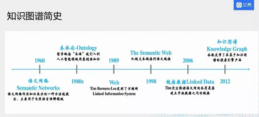 首先介绍下知识图谱的简史。1960年提出了语义网络,作为知识表示的一种方式,主要是帮助自然语言的理解,典型的就是WordNet,从不同维度表达词与词之间的语义关系。1980年提出了本体论,先定义一些本体再定义它们相关的关系,成熟的应用就是专家系统。1989年提出了万维网,然后1998年从超文本连接到语义网络,就是将每一个网页加一个语义含义。到了2006年提出了链接数据的概念,将互联网上的数据建立一些联系,如姚明的页面出现他妻子叶莉的信息,会给“叶莉”加一个链接。在2012年Google提出了知识图谱,目的是提升整个搜索效果。