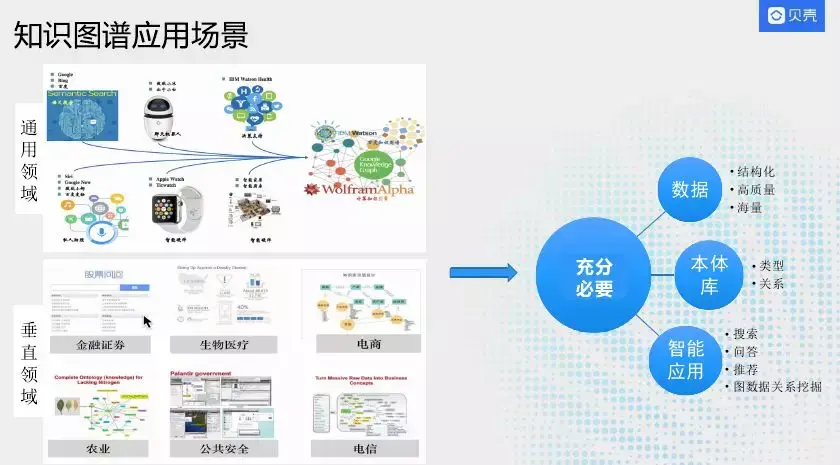目前知识图谱应用场景分为两块,一种是通用领域,一种是垂直领域。通用领域如Google的搜索领域,国内的百度和搜狗也在搜索领域应用;还有些聊天领域,如智能机器人、智能手表。这种应用有一个特性就是依赖通用知识图谱,构建依赖国外维基百科,国内有百度百科、搜狗百科,将页面中结构化数据抽取出来构建知识图谱来支撑通用领域的问答和搜索。垂直领域应用越来越多,如金融、电商、公共安全、农业、电信等,如金融里面的反欺诈,公共安全领域的追捕犯罪分子。不管是通用领域还是垂直领域落地有几个共性条件,第一个必须有一个结构化的数据,这个数据还要高质量,尽可能的海量数据;第二在数据基础上会抽象出一个本体库,从本体层面去定义实体类型,以及表示他们的关系,第三就是有可以利用数据和本体库的智能应用场景,依据知识图谱具有的优势和现有条件来确定业务场景是否需要知识图谱。目前知识图谱支撑的领域有搜索、问答、推荐、图数据关系挖掘。