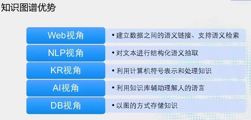 从知识图谱的一个发展史及其定义可以看出知识图谱具有5个视角优势,首先是Web视角,建⽴数据之间的语义链接、⽀持语义检索,第二个就是NLP视角,对⽂本进⾏结构化语义抽取。然后就是KR视角(知识表示),利用计算机的符号表示和处理知识。再者就是AI视角,利用知识图谱辅助理解人的语言,目前AI大部分是在垂直领域落地,会建立自己的知识库,帮助垂直领域人工智能的实施。DB视角,就是以图的方式存储知识。知识图谱展开其实是一个很大的知识网络,存储时会利用各种的图数据库存储。
