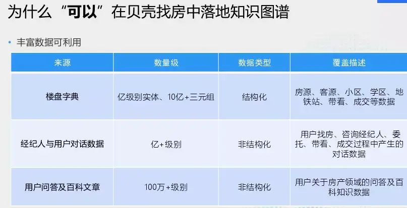 接下来讲一下知识图谱为什么能在贝壳找房中落地。首先我们有丰富的数据可以利用,从两个维度数据:结构化和非结构化。结构化有楼盘字典,数据亿级实体,10亿级的三元组。覆盖类型有房源、客源、小区、学区、地铁站、带看、成交等数据。还有非结构化数据,经纪人与用户对话数据,级别是亿级,主要是用户找房、咨询经纪人、委托、带看、成交过程中产生的对话数据。第三种是用户问答及百科文章,量级是100万+,非结构化数据主要是用户关于房产领域的问答及百科知识数据。