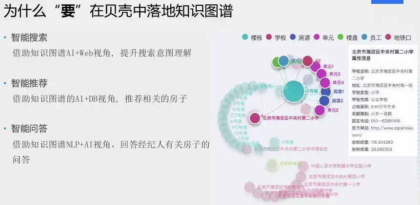 在智能搜索方面借助知识图谱AI+Web视角, 提升搜索意图理解;在智能推荐方面利用知识图谱的AI+DB视角;推荐相关的房子,在智能问答方面利用知识图谱NLP+AI视角,回答经纪人有关房子的问答。右图我们可以看到,在搜索一个学校时,我们可以看到与这个学校相关联的房源和学区等实体信息。
