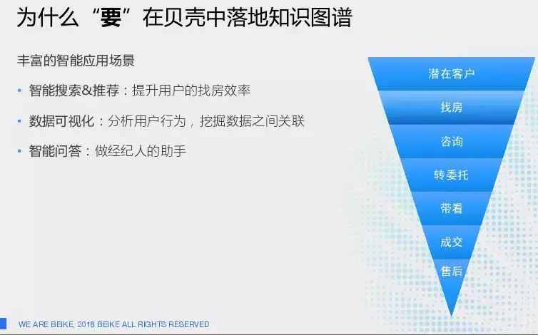 然后讲一下为什么要在贝壳找房中落地知识图谱,因为贝壳找房有丰富的应用场景,如智能搜索&推荐:提升用户的找房效率; 数据可视化:分析用户行为,挖掘数据之间关联, 智能问答:做经纪人的助手潜在客户找房咨询。右边的图是贝壳找房业务中的商业转化漏斗,这个过程涉及用户找房、到咨询经纪人、委托经纪人带看,最后成交几个环节。我们的目标就是帮助获得更多更优质的商机,以及提升他们的服务能力,帮助用户快速找到合适的房子,了解购房知识,拓宽这个漏斗图。