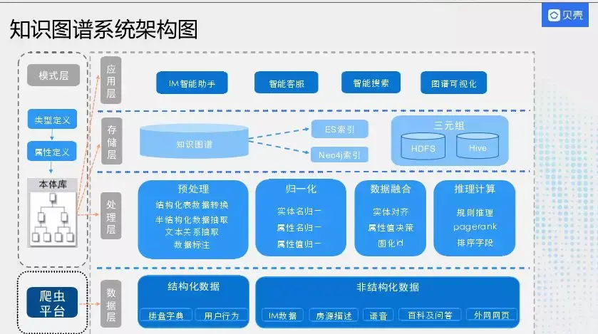 我们的知识图谱系统架构有五层,在数据层会有外网数据爬虫平台,大部分数据是内网数据,数据分为两块结构化数据和非结构化数据。处理层有预处理、归一化、数据融合以及推理计算。预处理方面结构化数据转换、半结构化数据抽取、文本关系抽取、数据标注,在处理完后会做一些实体名归一、属性归一、属性值归一。数据融合中会做一个实体对齐,因为实体会来自于不同的源,但是表达的是一个实体,可能存在交集或并集,或者一个属性有多个值,会做一个属性值的决策。推理计算会基于现有的数据做一些规则推理补充、pagerank、排序字段。整个生成后会形成一个知识图谱,建立ES索引或者neo4j索引,然后也会在hdfs或者hive里面进行备份,支持不同业务方调用数据。应用层有IM智能助⼿、智能客服、 智能搜索、图谱可视化。左边是我们的模式层,从类型定义、属性定义,最后构建本体库。本体库会支撑数据层、存储层、应用层。