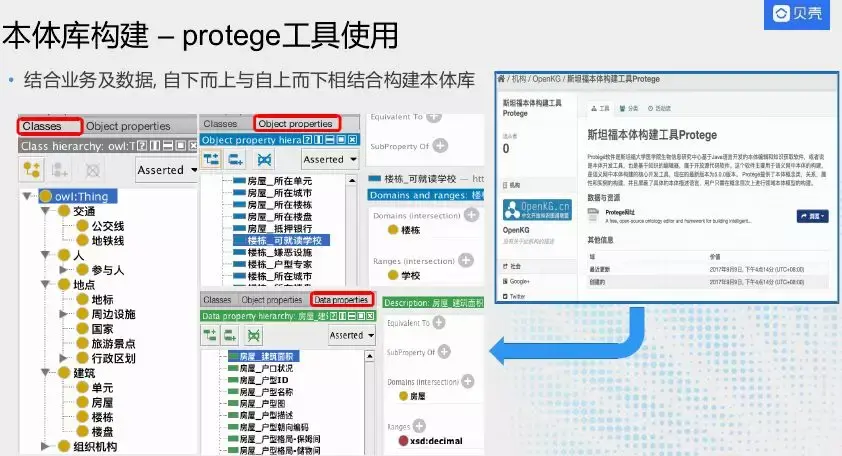 构建本体库使用构建工具protégé,主要有三块,第一块是class,第二部分是objects,这是个关系型的属性,描述两个实体关系的属性。Data property是内在属性,描述实体本身的属性。正常本体库构建是自下而上,从数据出发。但在我们的业务中会需要一些自自定义的属性,加入一些特殊的约束,因此采用自下而上与自上而下相结合构建本体库。在构建的过程中也加入了对属性关系的自定义约束,如是否加密、显示顺序、是否归一化等约束。