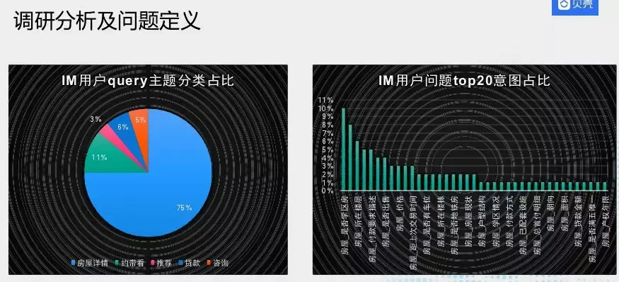 接下来介绍下知识图谱在IM智能助手中落地,应用场景是更快解决用户问题,提升经纪人的作业效率。依据历史经纪人与用户聊天数据进行了一个分类,用户主要问五种类型问题,75%是于房屋详情问题、10%是约带看、6%是贷款、3%是推荐。右图是整体75%问题中top20的意图占比,问的最多的是学区房问题。从0到1做这个事情,我们优先解决了75%房屋详情问题。