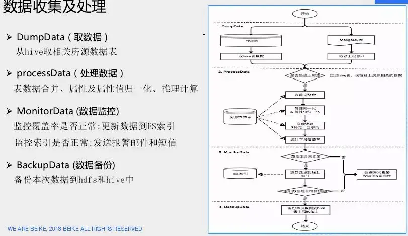 针对这些问题进行数据搜集与处理流程,首先从楼盘字典中获取所需的房源数据,然后进入知识图谱构建流程,整个统计完成后会计算其覆盖率,最后进入ES索引里面,最后会判断数据是否符合预期,符合后才会建立索引,也会对异常进行一些监控报警。
