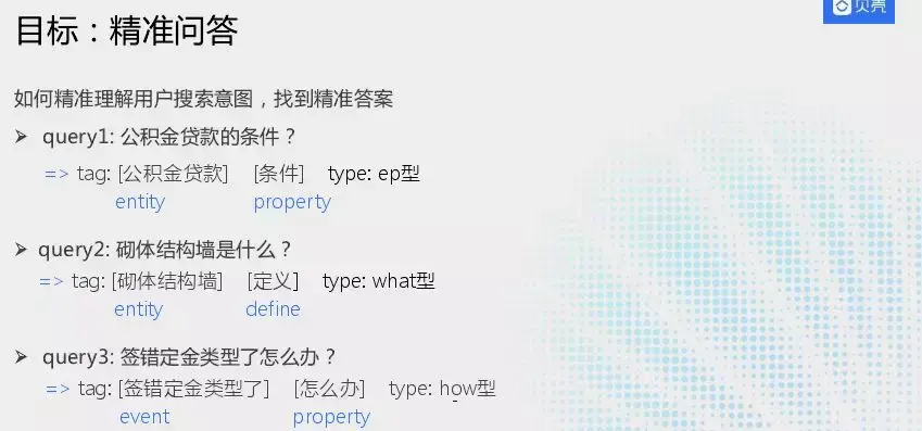 如何精准理解用户搜索意图,找到精准答案。如“公积金贷款条件?”我们会把公积金作为一个实体,将条件作为一个属性,这种就是EP型,还有“砌体结构墙是什么?”这种就是what型。“签错定金类型了怎么办?”,将“签错定金”定义为event,“怎么办”定义为属性,这种归为how型。是一种基于语义的搜索而不是传统基于关键词或者语义相似度做计算。