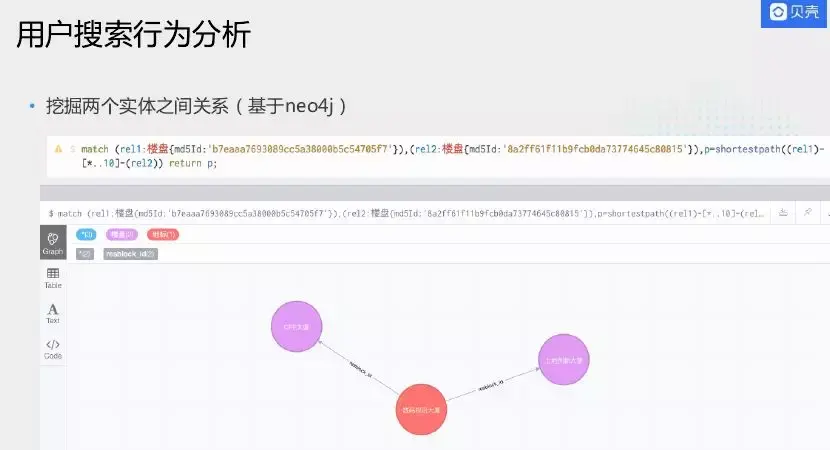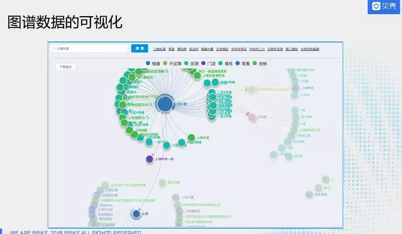 上图是我们自己研发的图数据可视化平台,将贝壳找房所有涉及的实体进行可视化展示。目的是展示内部数据间关联关系,后期让C端用户能够更好的找房子而不是直白的搜索列表,返回什么就看什么,可以主动的在知识图谱知识网络中漫游。