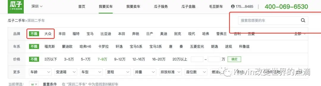 瓜子二手车的搜索也是集中输入。但分类输入在设计上可以通过列举不同唯独的搜索信息,最终点击提交。但这种设计只为在产品的内容信息架构较为结构化,有单独的字段描述出发不同唯独类型的数据。