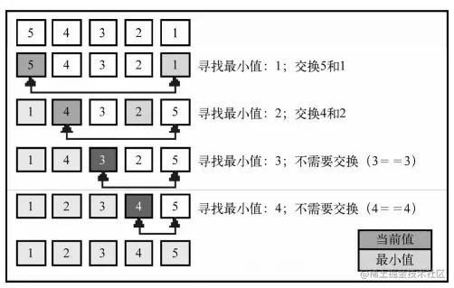 选择排序同样也是一个复杂度为O(n2)的算法。和冒泡排序一样,它包含有嵌套的两个循环,这导致了二次方的复杂度。