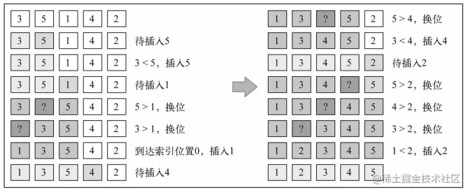 总结一句话:当计算a的正确位置,与比a的索引小的值比较,将比a大的值全部往后移动,腾出位置,将a插入
