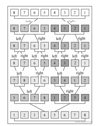 归并排序是一种分治算法。将元是数组切分成较小的数组,直到每个小数组只有一个位置,接着将小数组归并成为较大的数组,直到最后,只有一个排序完毕的大数组。