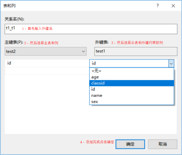 5、在表和列窗口中-》输入外键名-》在左边选择主表和关联的列-》在右边选择从表和作为外键的列-》点击确定。