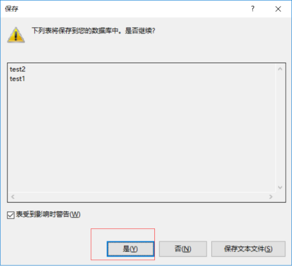 7、点击保存按钮(ctrl+s)-》此时表会弹出警告窗口,点击是-》刷新查看外键是否添加成功。