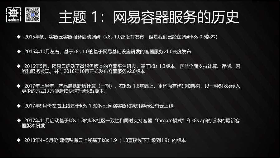 2015 年网易云容器已经开始启动基于 Kubernetes 0.6 版本的调研,当时 Kubernetes 1.0 还没有正式发布。2015 年 10 月,基于 Kubernetes 1.0 版本,我们发布了容器服务 1.0 版本。2016 年我们启动了基于微服务版本的容器平台开发(基于 Kubernetes 1.3 版本)。在 2016 年 10 月,我们正式发布了容器服务 2.0 版本。2017 年 10 月一直到现在,我们主要用的是 1.8 和 1.9 版本。在发布 2.0 版本后,1.8 和 1.9 版本的使用就正式回归到原生。现在我们已经在私有云上线了基于 Kubernetes 1.9 的正式版本。