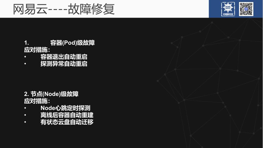 现在说一下,网易云针对容器故障场景的应对措施。第一,容器级故障以及节点级故障。在容器级别故障下,我们会采取自动重启容器实例。如果我们对容器探测出现异常,我们会去触动自动修复。容器实例相对于虚拟机启动,耗时更短,业务感知度会比云主机低很多。