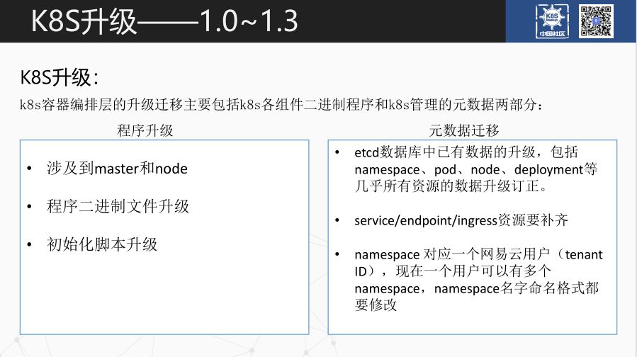 对于这种模块,我们需要去对 Namespace 的名字和存储格式都进行修改。以上都是对于 Kubernetes 本身升级部分。对于除 Kubernetes 外的其他部分,最大的问题是在 Docker 升级及升级后 Docker 容器实例与 Kubernetes 兼容性。目前来看,整个社区都没有解决方案去升级 Kubernetes+Docker。