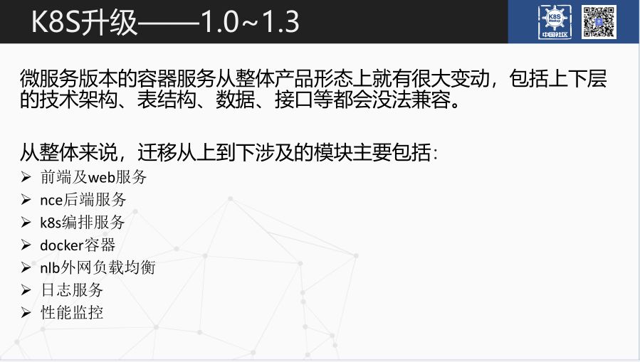 所以在面对差异版本时,包括技术架构、表结构、数据等,都很难做到兼容,由此造成的升级难度很大。从整体上来看,整体服务迁移主要涉及前端和 Web 服务,NCE 后端包括 Kubernetes 模块、NLB 的负载模式均衡、日志和性能数据等。