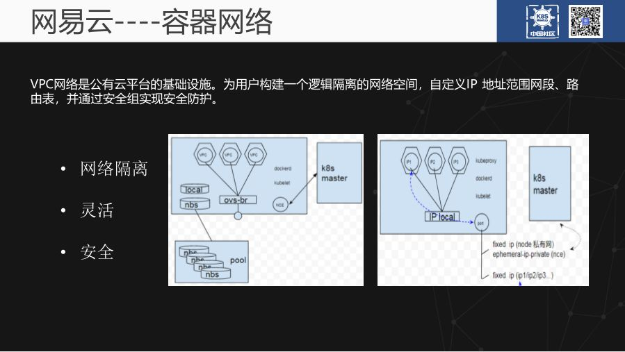 这张 PPT 中左边图主要是裸机容器实例,裸机设备使用两个接口,一个接口是直接打通到 Kubernetes Master 网络,Kubernetes Masber 通过这个管理口,去下发配置来创建裸机容器实例。裸机容器实例通过 veth pair 和 OVS datapath 网络打通容器流量就可以通过 OVS 进入到虚拟网络中。容器流量可进入到 VPC 网络内。