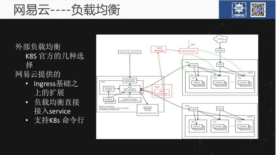 同时我们也深度整合了网易云的基础资源,租户的 VPC 内部兼容云主机和容器实例。容器包括基于虚拟 KVM 主机的容器实例和基于高性能物理机的裸机容器。同时,容器服务兼容经典网络和 VPC 网络,支持本地盘和基于 Ceph 的普通云盘,结合了网易云自研的 NLB 提供负载均衡服务。在使用 Kubernetes 容器服务的同时,做了比较多的性能优化和功能增强。