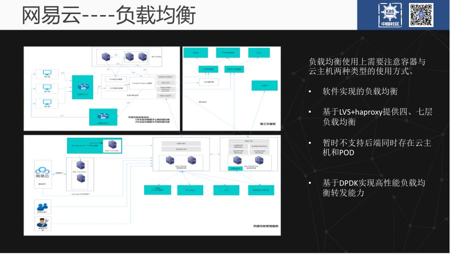 这一页是对外公网类型的负载均衡的架构。从图上看,左上角是负载均衡集群。负载均衡,我们主要是通过 LVS +HAProxy 提供负载均衡。右侧是第三方服务,主要是为了监控负载均衡集群的服务状态,做一些日志和告警。下面这部分是管理模块,正常用户可以直接通过控制台去下发,或者通过 API Gateway 下发配置到基于云主机的负载均衡实例上,也可以通过调用 Kubernetes 来配置基于容器的负载均衡实例。