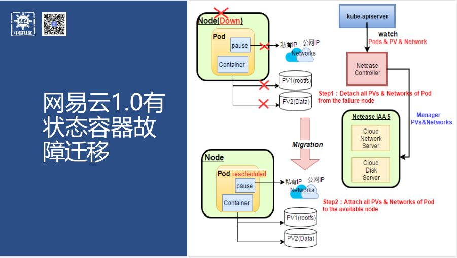 这是网易云最开始的容器服务处理节点级故障。首先在 Node 节点上有配置机器的心跳检测。一旦心跳持续丢失识别出节点故障,会上报给 Kubernetes,Neatease Controller 模块会订阅 Master。关于节点故障时间触发基础服务的网络模块和存储模块会 detach 掉容器的网络配置和容器使用的系统盘和数据盘,同时会调度在新节点创建新的容器实例,将老的网络和存储配置重新 attach 到新的容器实例中。